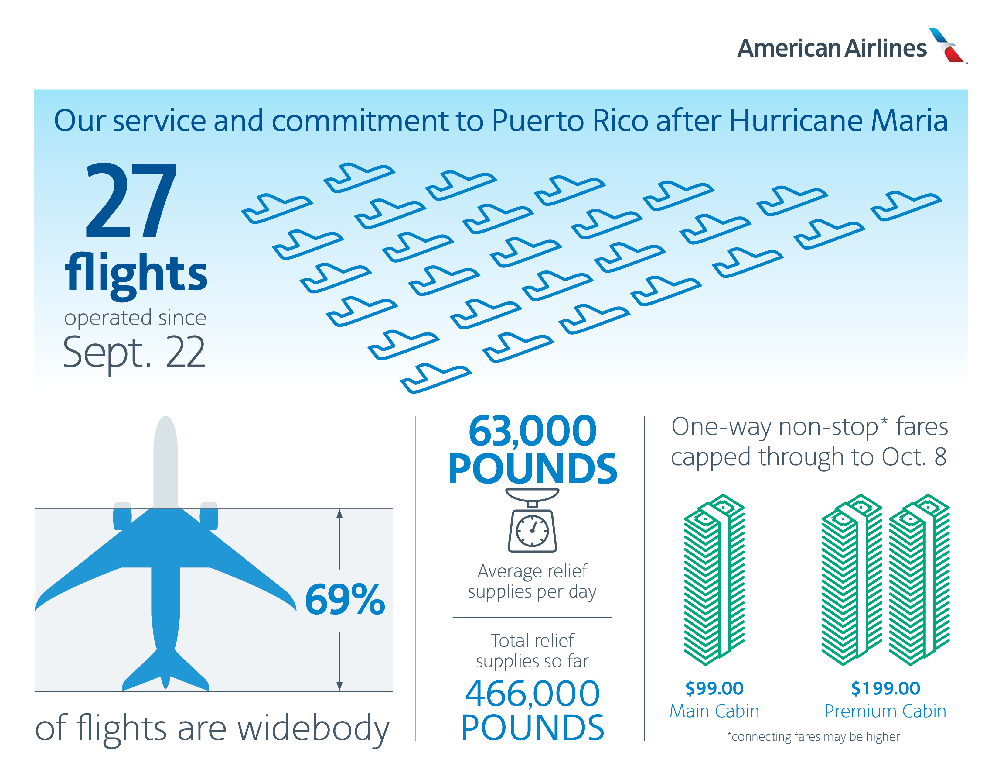 American is committed to operating as many flights as permitted by the airport, FAA and FEMA. We continue to operate more widebody aircraft to and from Puerto Rico than any other airline, and have transported more than 460,000 pounds of relief supplies since the storm hit.