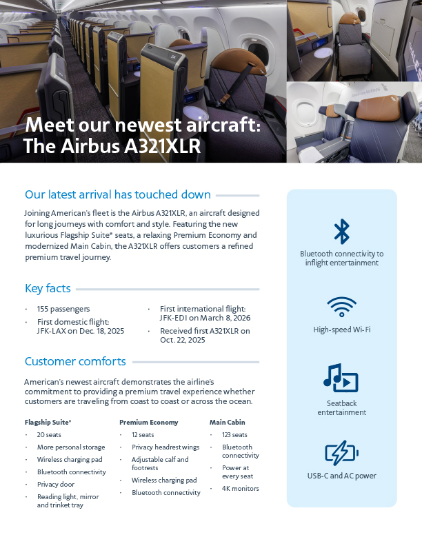 FORT WORTH, Texas — American has elevated transcontinental travel today with the inaugural flight of its Airbus A321XLR, carrying more than 150 passengers between New York’s John F. Kennedy International Airport (JFK) and Los Angeles International Airport (LAX). As the only U.S.-based airline to operate the A321XLR, the aircraft is a class above the rest, offering customers a Flagship Suite®, Premium Economy and Main Cabin experience.