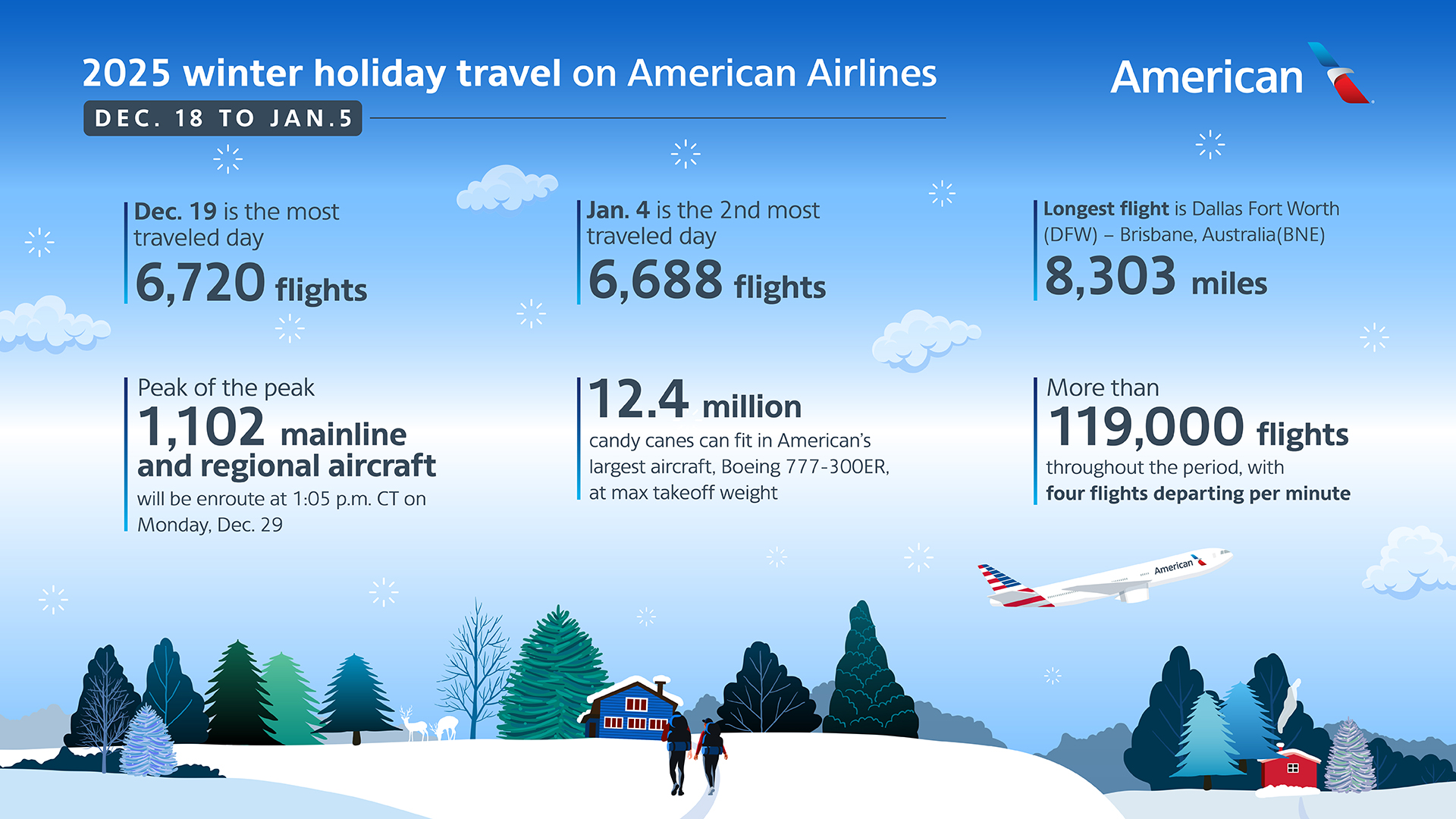 “Our more than 130,000 team members are committed to making our customers’ journeys on American this holiday season safe, reliable and enjoyable,” said David Seymour, American’s Chief Operating Officer. “Our team did an incredible job caring for customers during the recent Thanksgiving holiday and is excited to be serving them again wherever they’re headed for the holidays. We have been closely coordinating with our federal partners at the FAA, TSA and CBP, and we are confident that they are ready to partner with us to make this holiday season a success.”