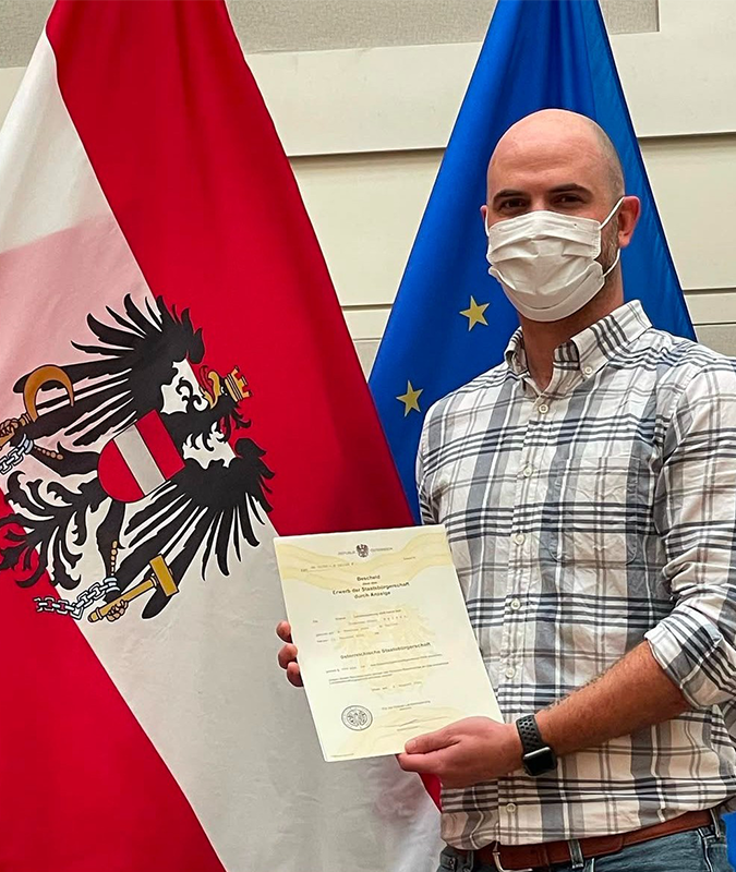 When his application was accepted in September 2021, Jonathan used his travel privileges to fly to Washington, D.C. and receive his official citizenship and apply for his Austrian passport.